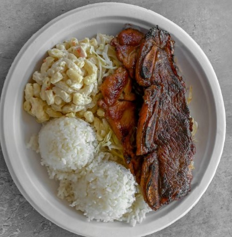 Grilled chicken marinated in a sweet and tangy sauce, served with rice and macaroni salad.