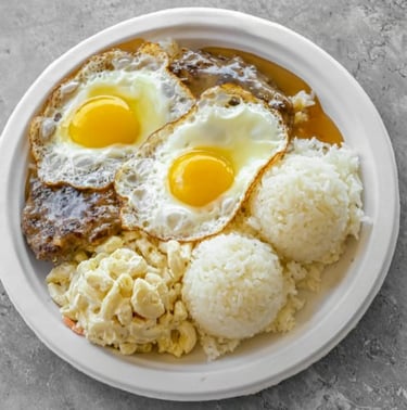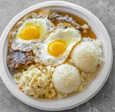 House-made hamburger steak on a bed of rice topped with gravy and eggs.