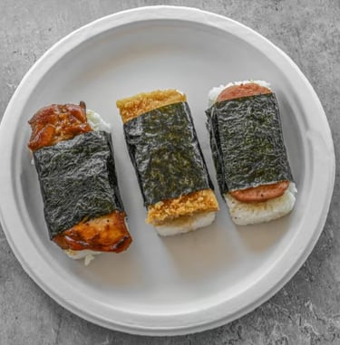 Delicious crispy spam on a block of rice doused with teriyaki sauce and wrapped in nori seaweed.